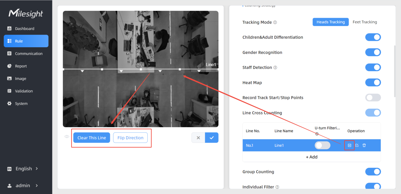 Users can draw detection lines to count the number of people entering or exiting.