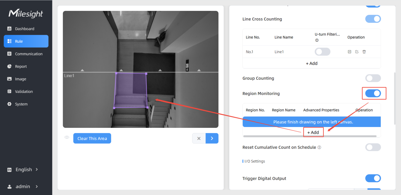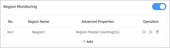 Step 2: Enable Region Monitoring. Click +Add to add the region monitoring on the live view. Up to 4 regions are supported with maximum 10 segments each.