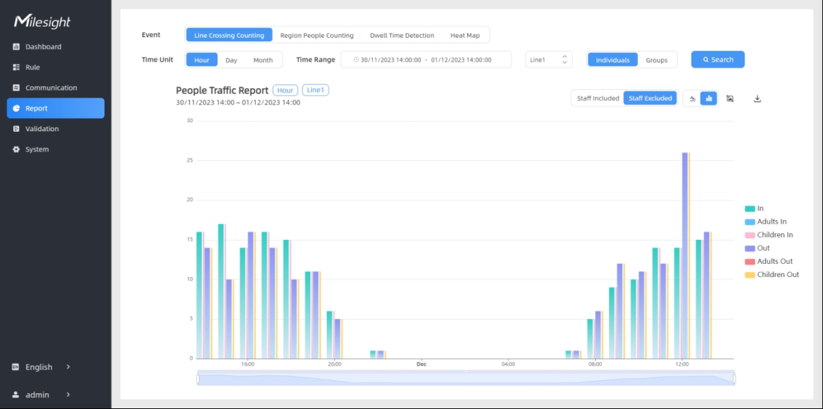 The device supports visual line chart or bar chart generation to display people traffic and supports report exporting. Before using this feature, do ensure that the device time is correct on System page.