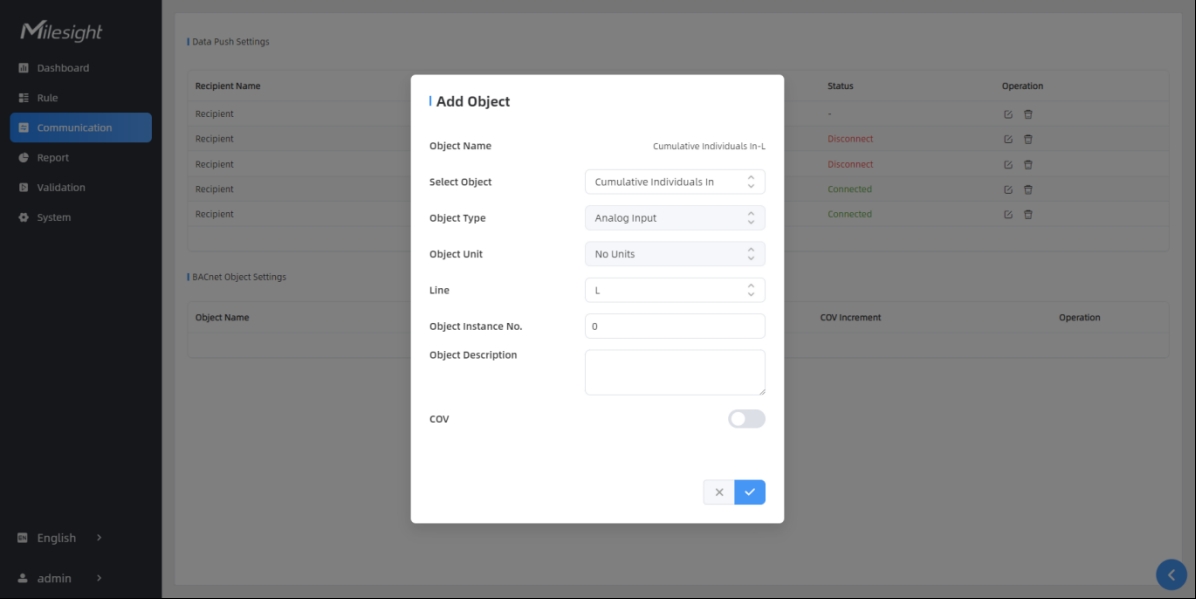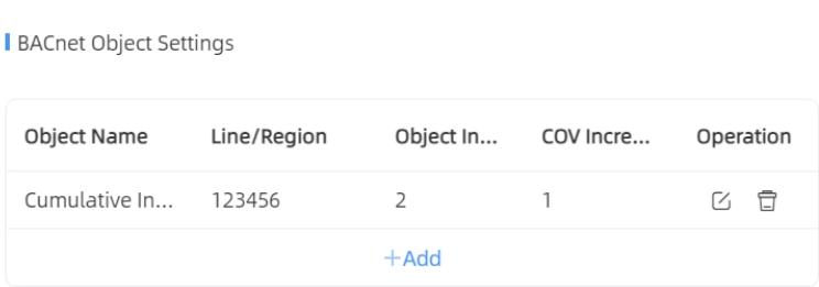 | COV | Enable, when object value changes, it will send notification of new value to BACnet client. |