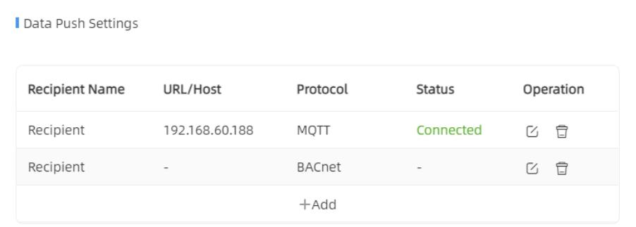 The device supports to add data receivers (supports HTTP(s)/MQTT(s)/BACnet). The device will proactively push data to the receivers according to the configured reporting scheme.