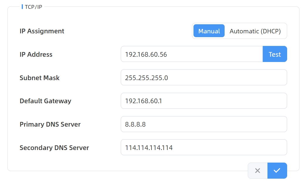 | IP Assignment | Manual or Automatic (DHCP) is optional. |