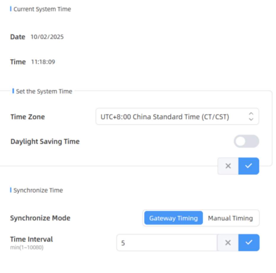 | Synchronize Mode | Synchronize the time. Gateway Timing or Manual Timing is optional. |
