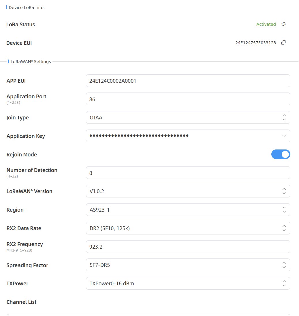| Application Key | Appkey for OTAA mode, default value: "Device EUI" + "Device EUI"