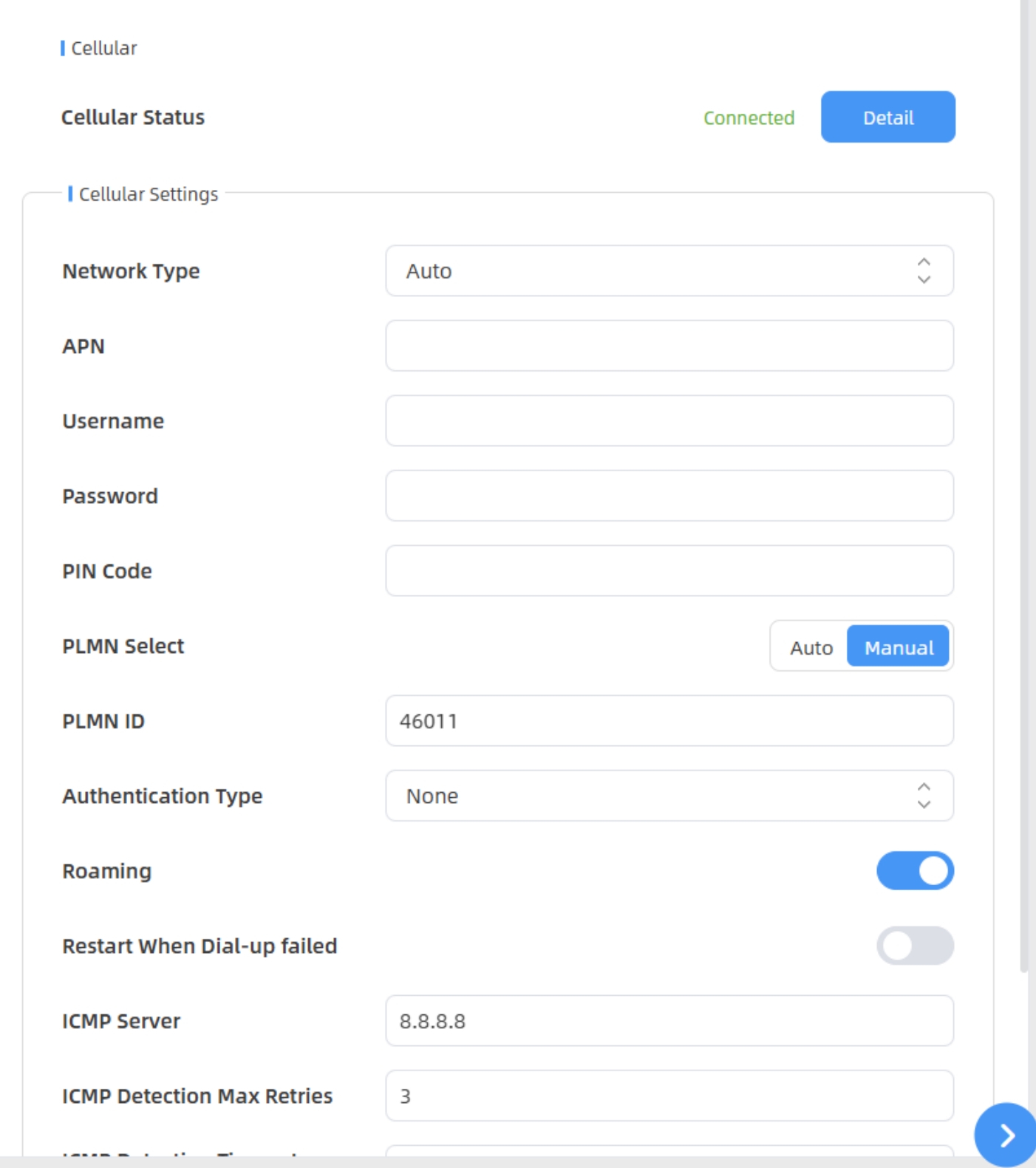 network, including “connect” and “disconnect”. You can also click “Detail” button to view the cellular status. |