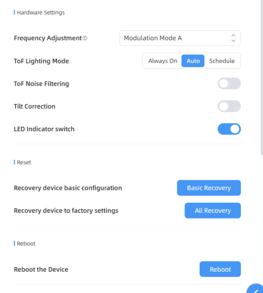 | ToF Lighting Mode | Adjust the ToF light mode as Always