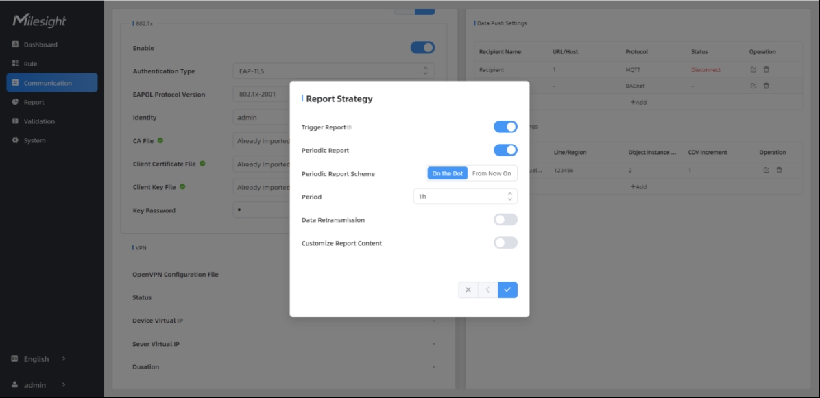 The device supports adding data recipients (supports HTTP(s)/MQTT(s)/BACnet). The device will proactively push data to the receivers according to the configured reporting scheme.