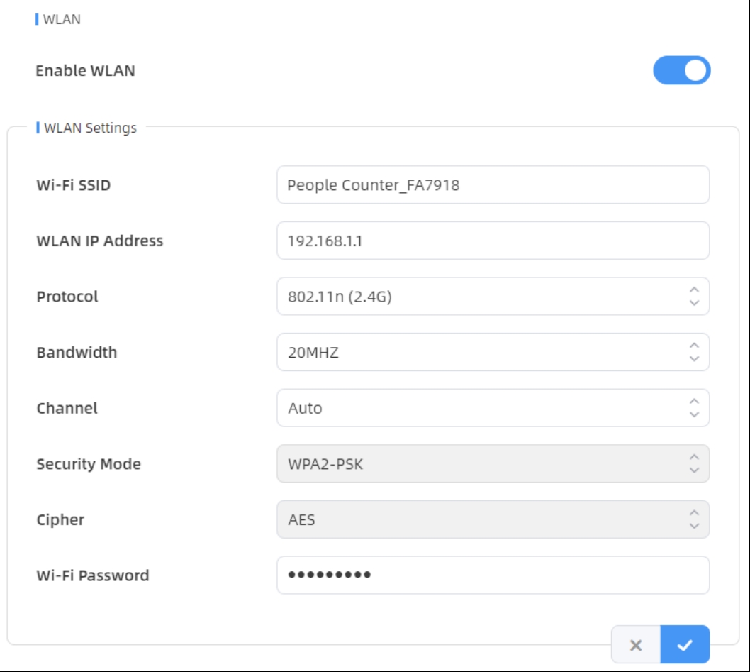 | Wi-Fi SSID | The unique name for this device Wi-Fi access point, defined as People Counter_xxxxxx (can be found on the device label). |