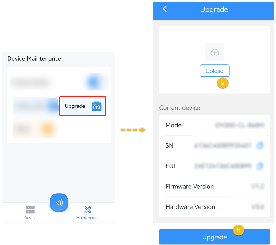 - Read the target device via ToolBox App, click Upgrade to upload the firmware file.