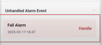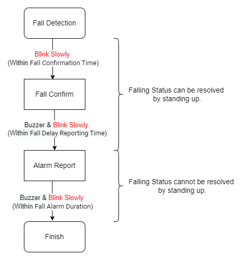 An alarm message will be reported. The LED will still blink red quickly and the buzzer will sound for a duration that depends on the Fall Alarm Duration. The alarm cannot be canceled by standing up but can be resolved by clicking the Handle button on the <Information> page.