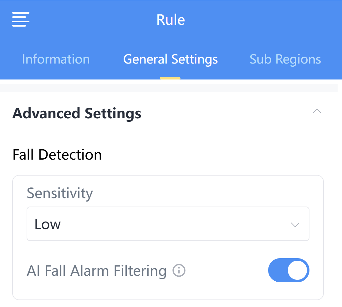| AI Fall Alarm Filtering | When enabled, this feature performs secondary fall detection, reducing false