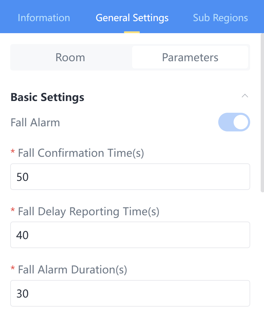 | Fall Alarm Duration | The duration for which the alarm and buzzer will sound. Default: 30s, Range: 0~1800s. |