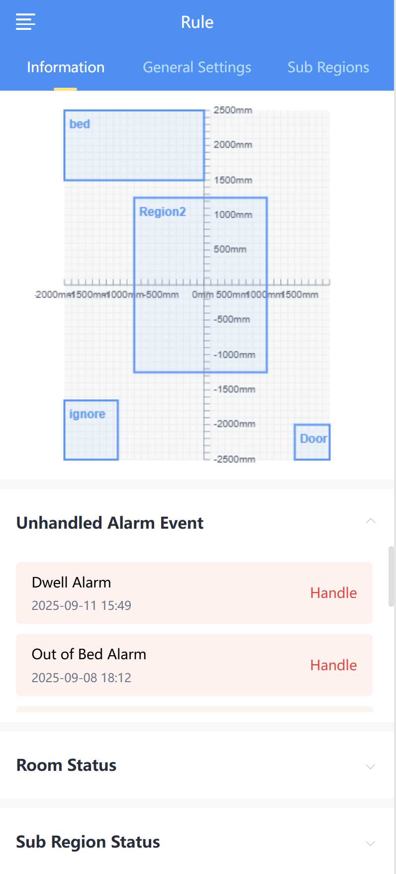 The motionless alarm is triggered when a target’s coordinates remain unchanged for a long period, indicating a possible abnormal condition. This function is suitable for environments with expected frequent movement (e.g., hospital wards, corridors), enabling prompt detection of emergencies or unusual behavior.