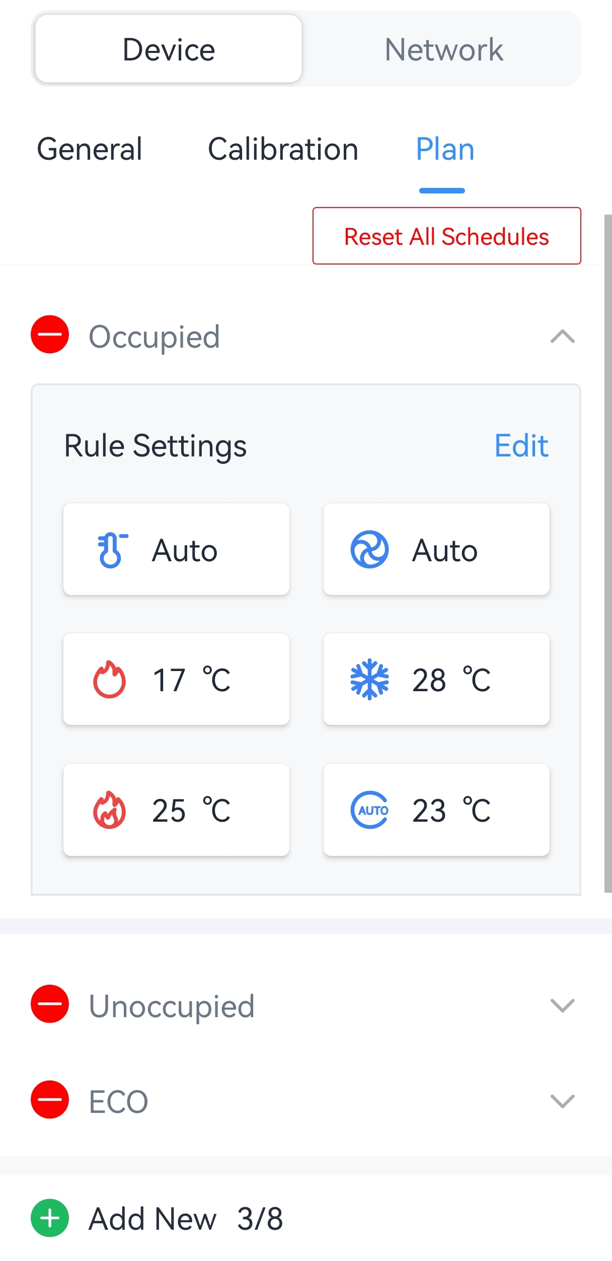 The device supports adding different kinds of schedule plans to achieve the automatic temperature control.