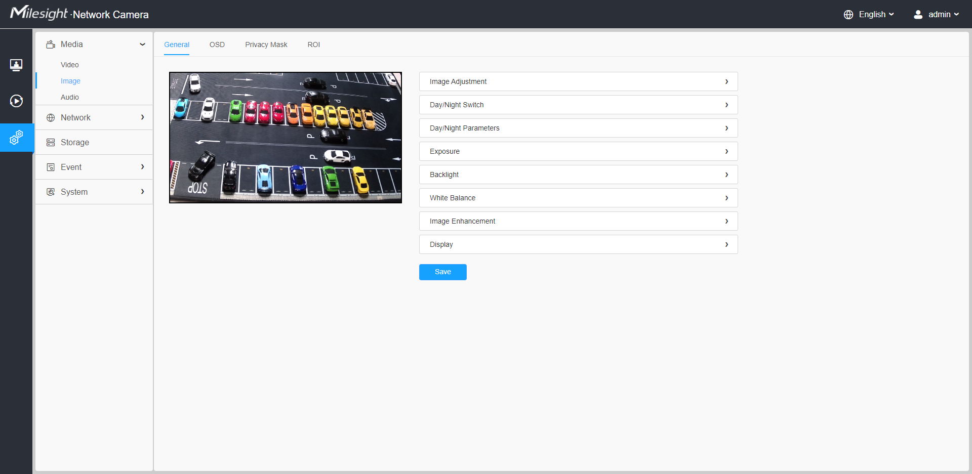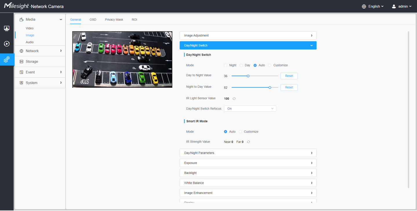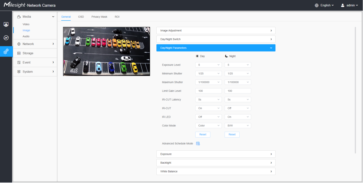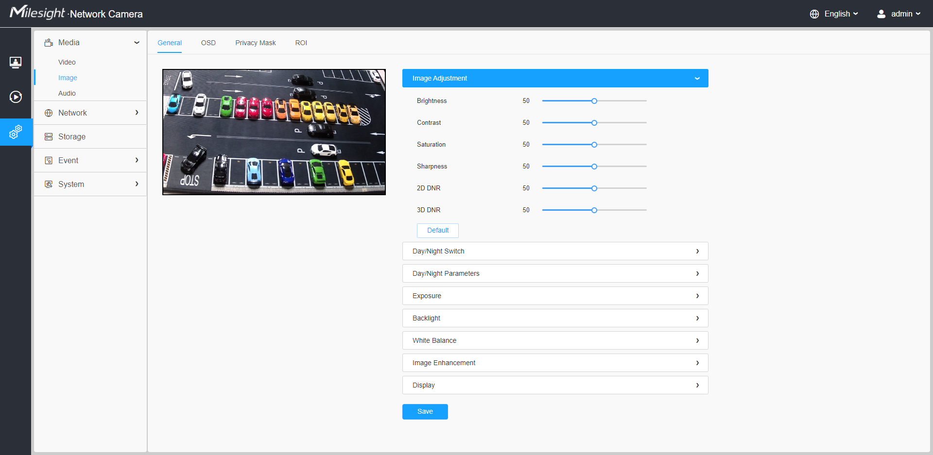 General settings of image including the Image Adjustment, Day/Night Switch, Day/Night Parameters, Exposure, Backlight, White Balance, Image Enhancement and Display can be set in this module.