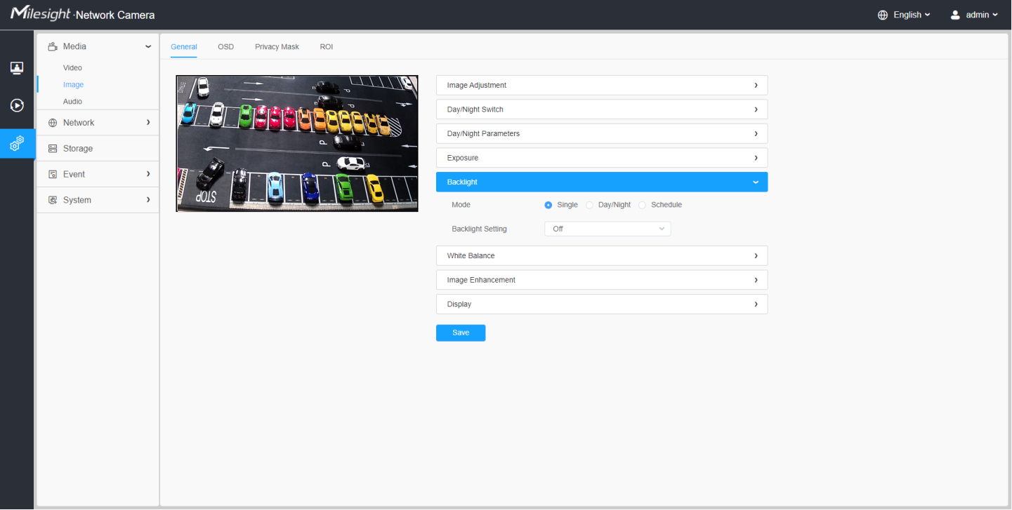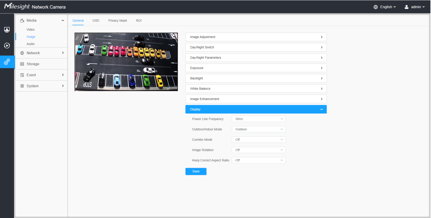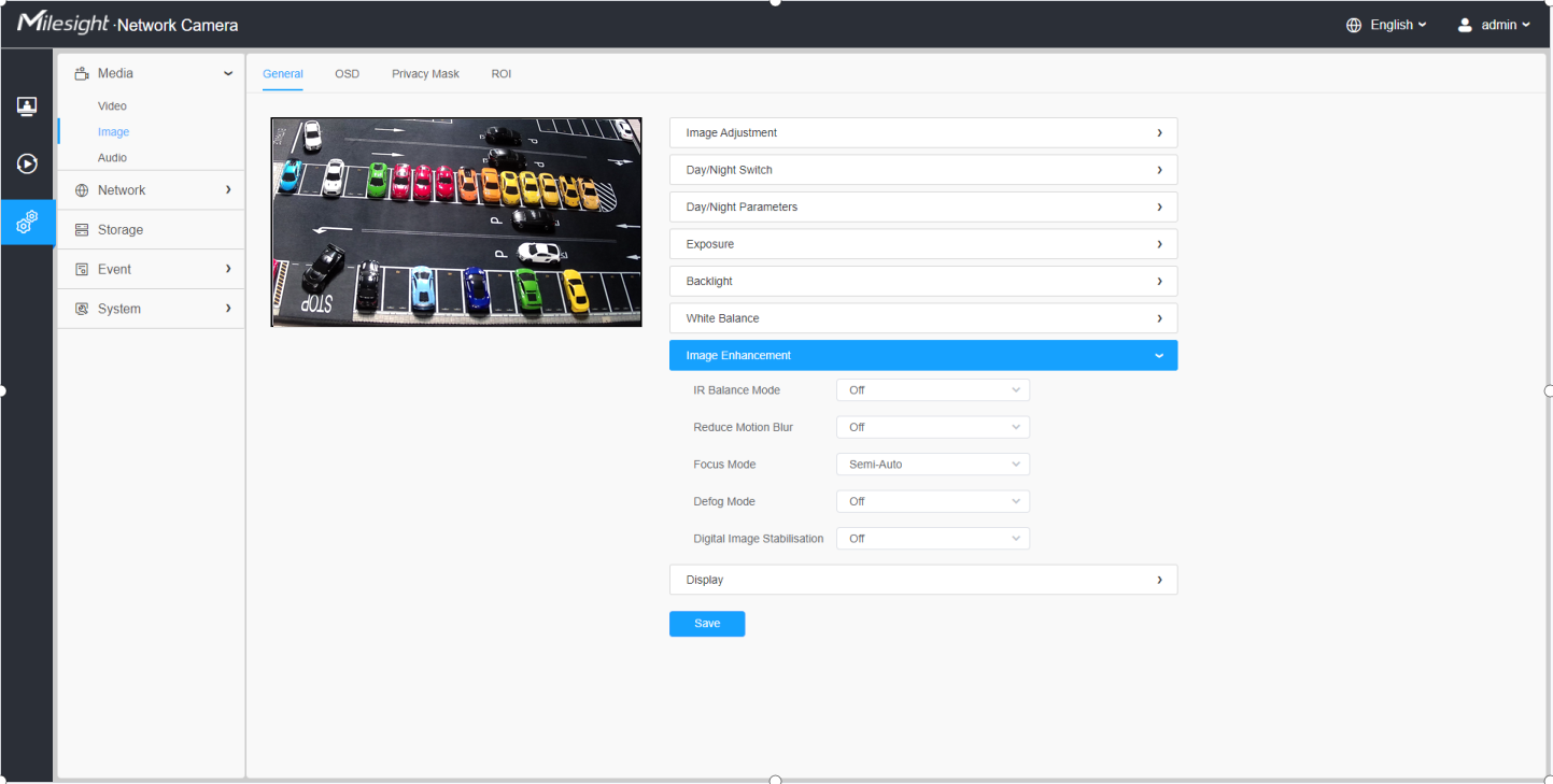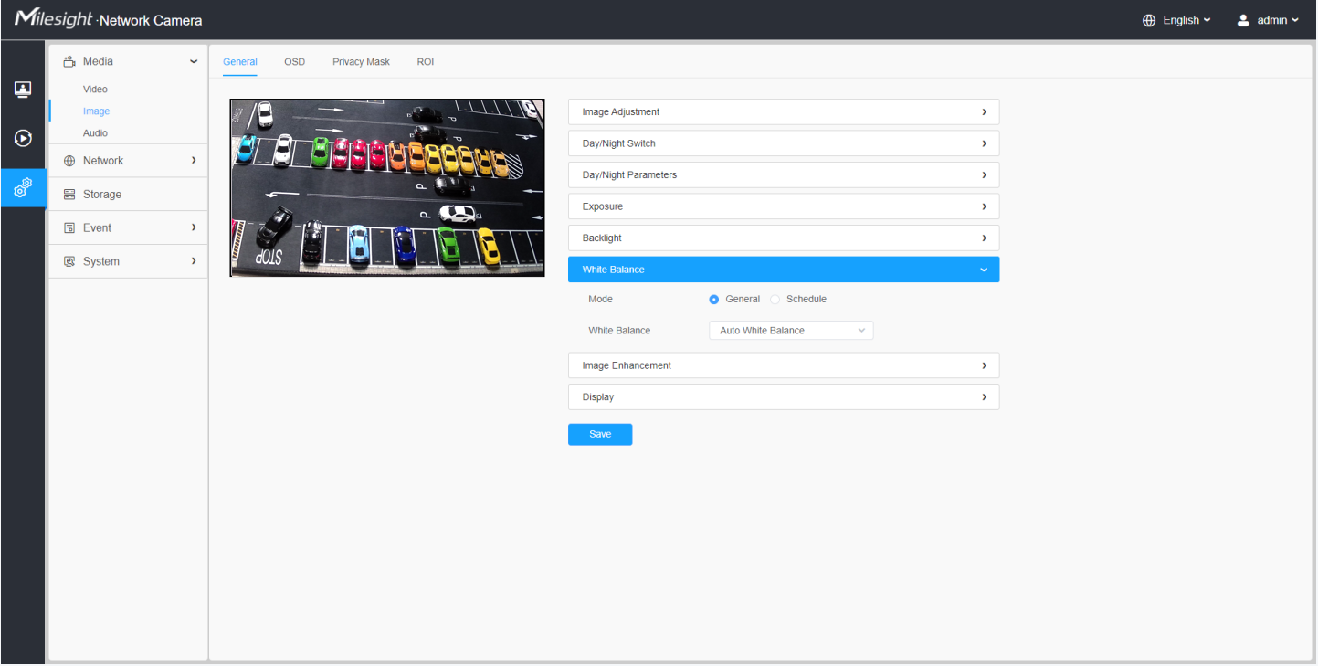 General settings of image including the Image Adjustment, Day/Night Switch, Day/Night Parameters, Exposure, Backlight, White Balance, Image Enhancement and Display can be set in this module.