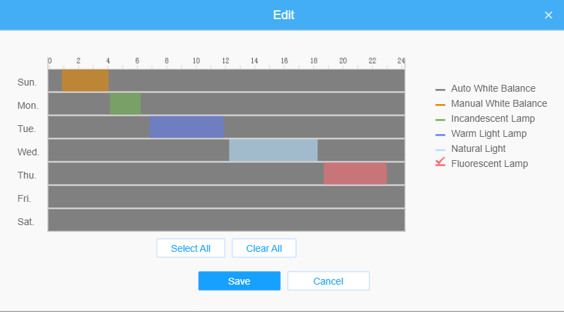 | White Balance | To restore white objects, removed color distortion caused by the light of the environment. Mode: General and Schedule are available. |