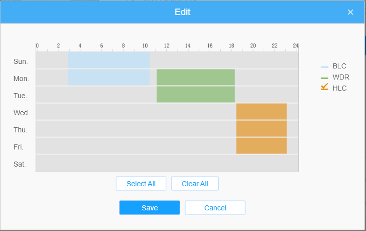 enabled. Day/Night Mode: Support BLC/WDR/HLC on Day Enhancement Mode/Night Enhancement Mode separately. Schedule Mode: Set schedule mode for BLC/WDR/HLC. You can customize the schedule to enable/disable BLC/WDR/HLC mode.