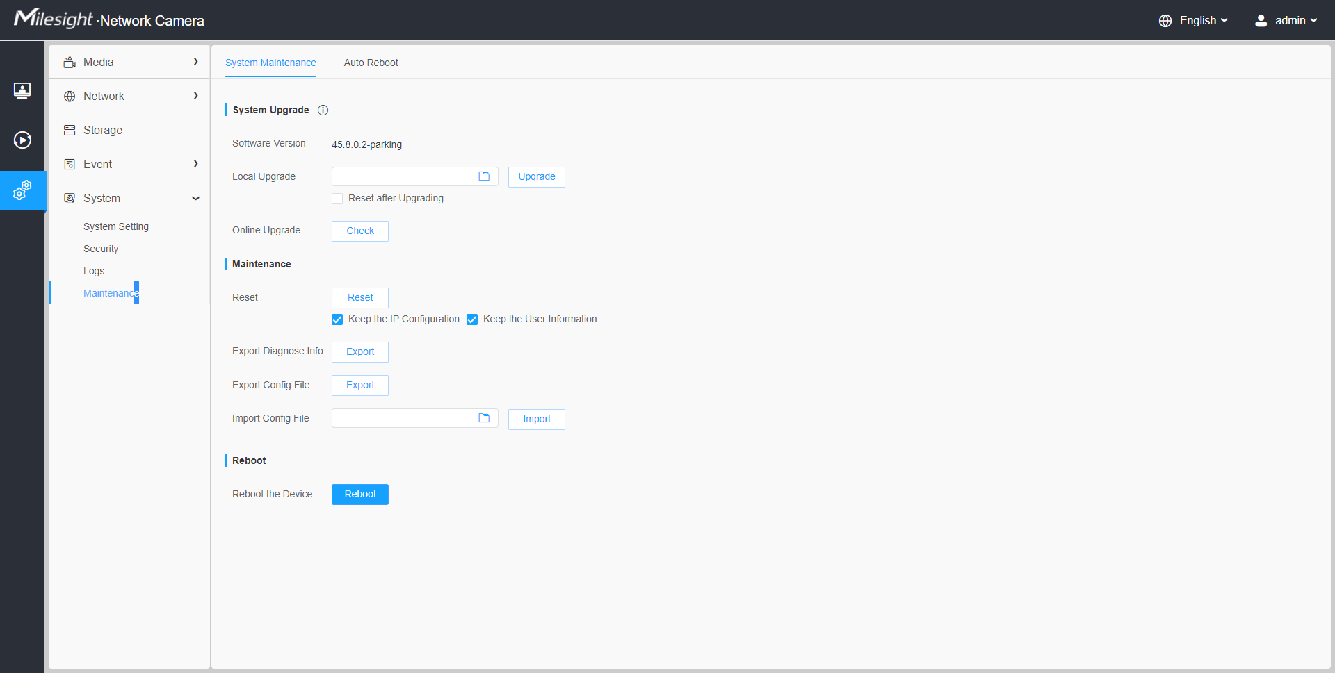 Reset: Click “Reset” button to reset the camera to factory default settings. Keep the IP Configuration: Check this option to keep the IP configuration when resetting the camera. Keep the User information: Check this option to keep the user information when resetting the camera. Export Diagnose Info: Click this button to export logs and system information of the device operation status. Note: The file format is “.txt”.