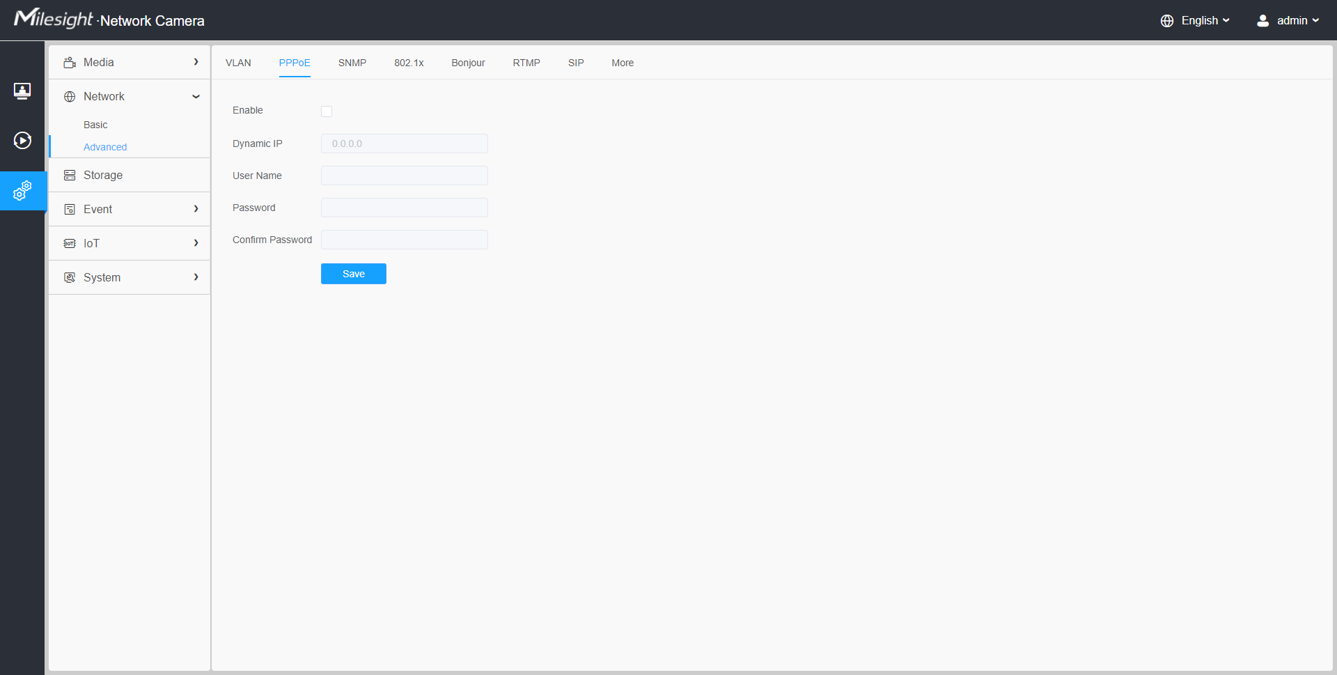 This camera supports the PPPoE auto dial-up function. The camera gets a public IP address by ADSL dial-up after the camera is connected to a modem. You need to configure the PPPoE parameters of the network camera.