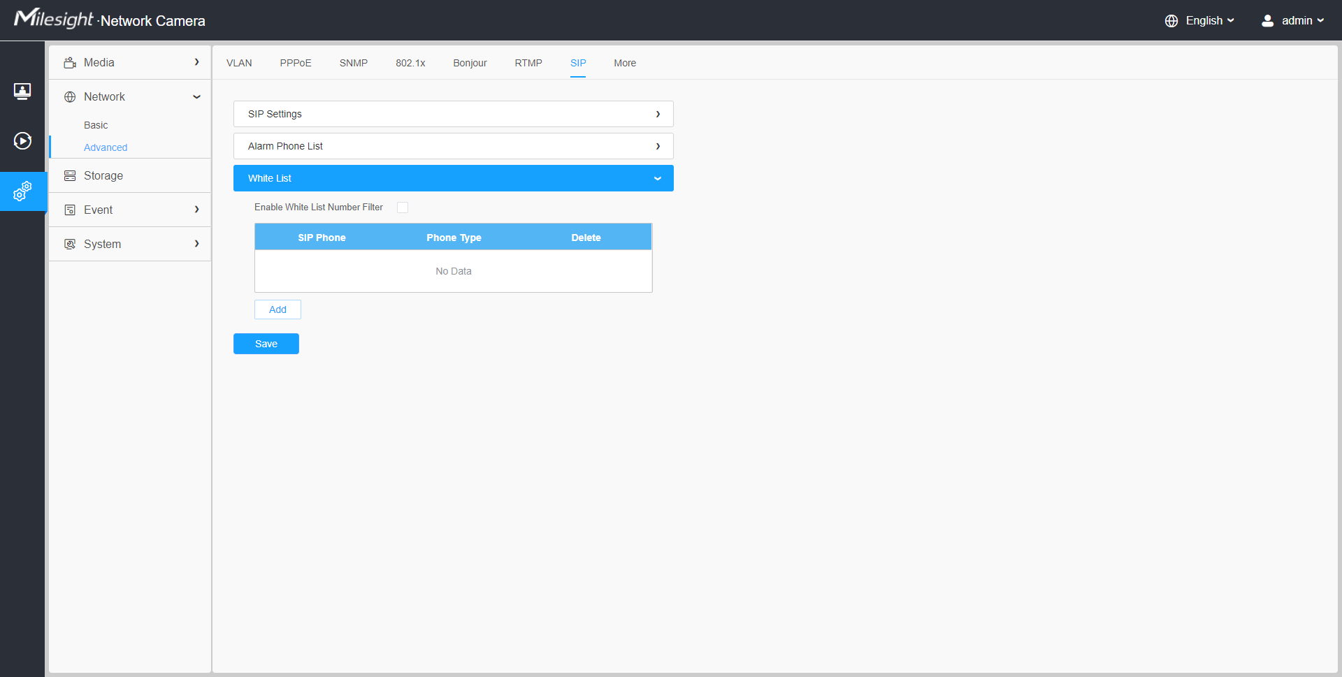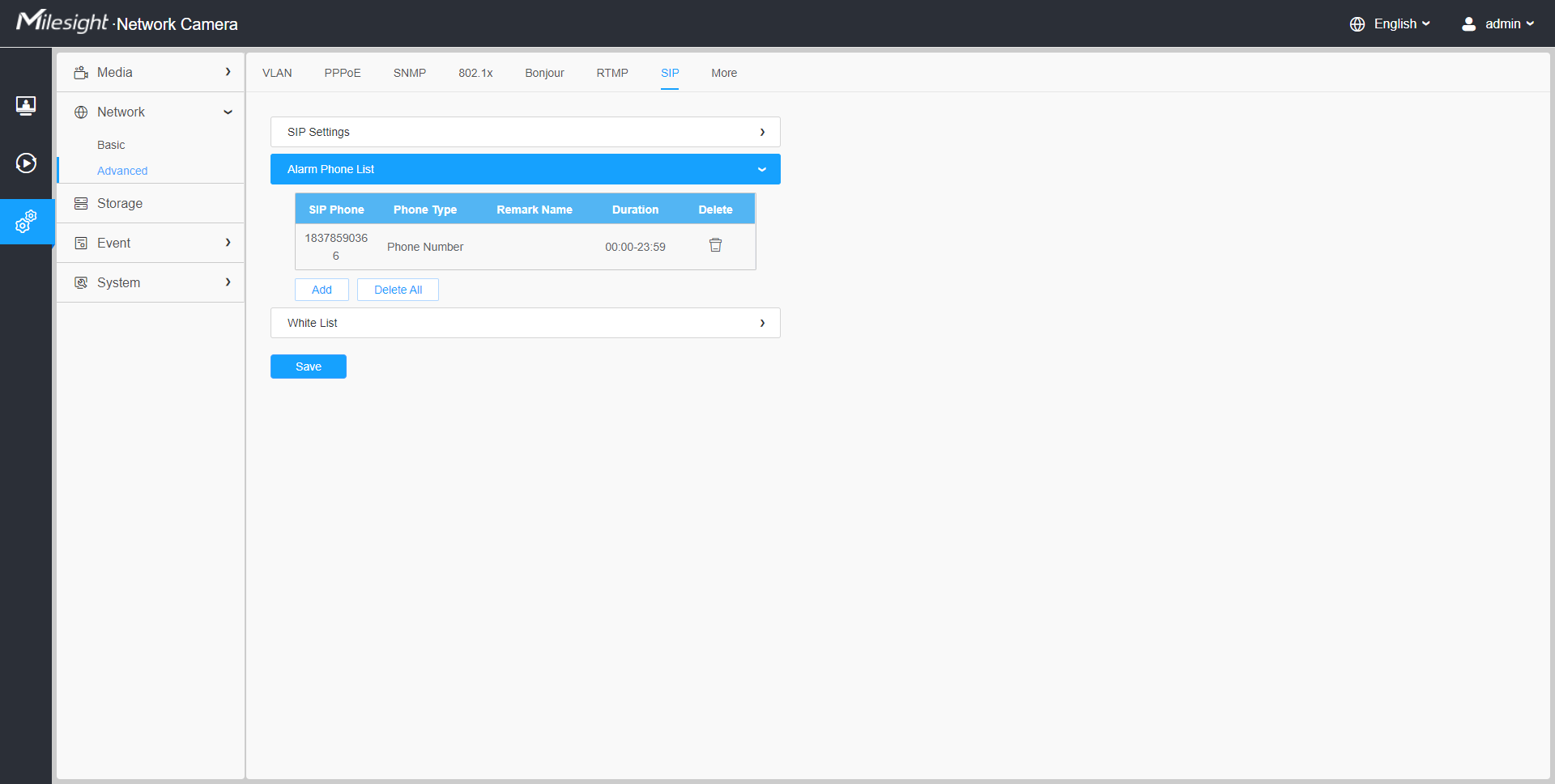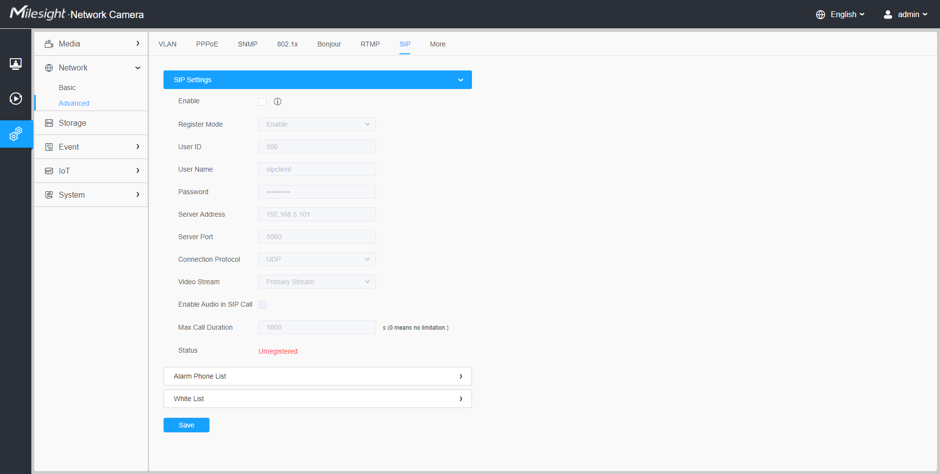 The Session Initiation Protocol(SIP) is a signaling communications protocol, widely used for controlling multimedia communication sessions such as voice and video calls over Internet Protocol (IP) networks. This page allows user to configure SIP related parameters. Milesight can be configured as SIP endpoint to call out when alarm triggered; or allow permitted number to call in to check the video if the video IP phone is used.