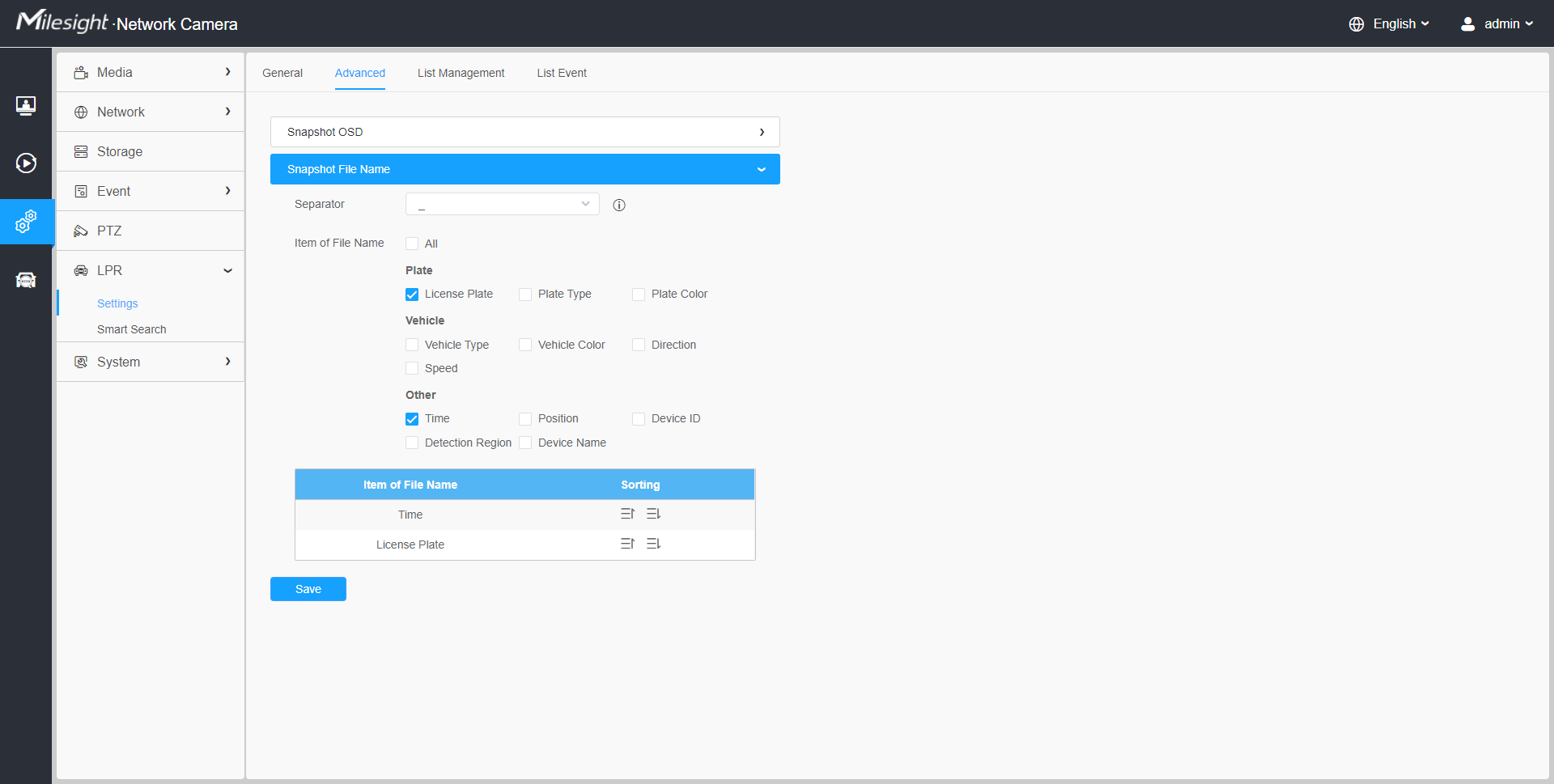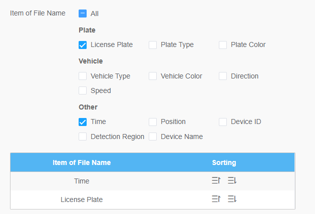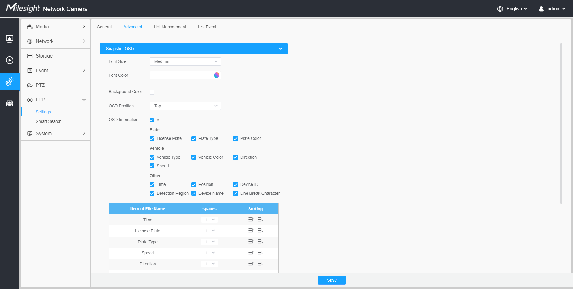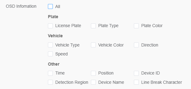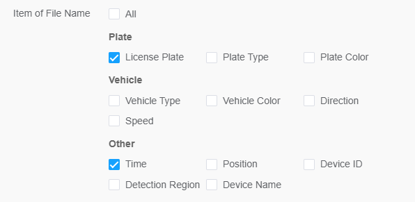 In the interface, you can set display information on snapshot of license plate recognition, and also customize the file name of snapshots which are uploaded via FTP or Email or stored on local LPR Picture File Path.
