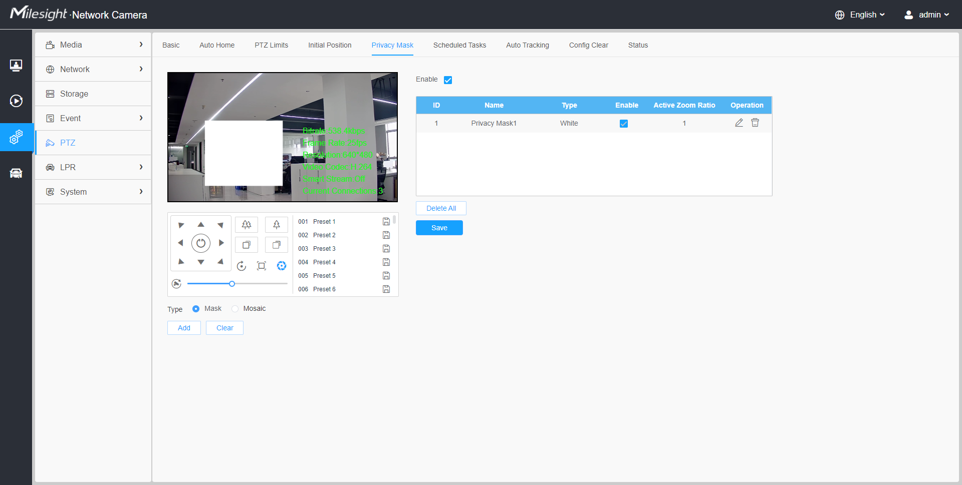 Privacy mask enables to cover certain areas on the live video to prevent certain spots in the surveillance area from being viewed and recorded. The mask area does not move as the lens moves.