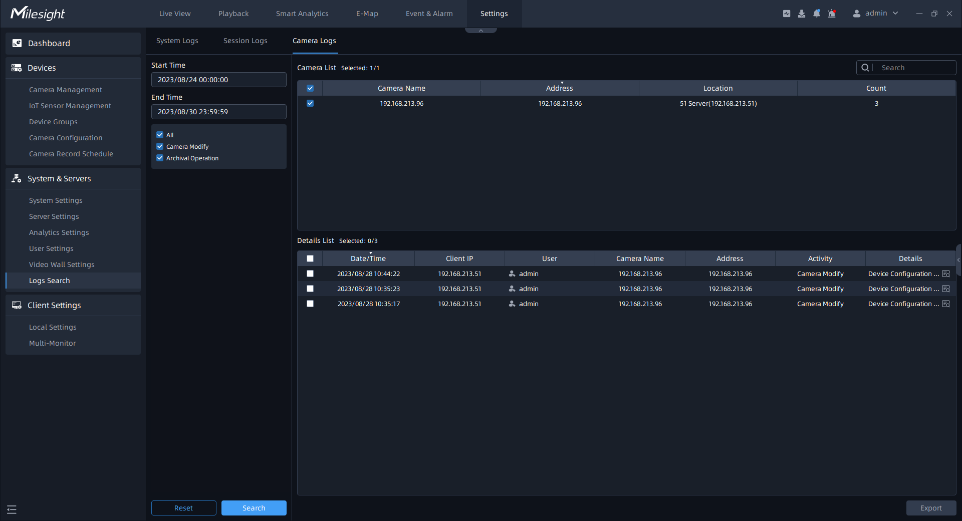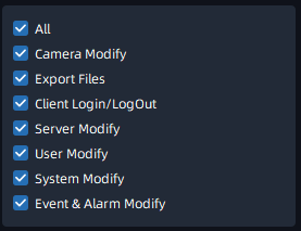 Here you can filter out the interested logs by checking the option box. All: Check the “All” checkbox to search all operation logs. Camera Modify: Check the condition checkbox to search all operation logs about Device Configuration and Device Event.Export Files: Check the condition checkbox to search all operation logs about successful export of the channel files in the Playback interface. |