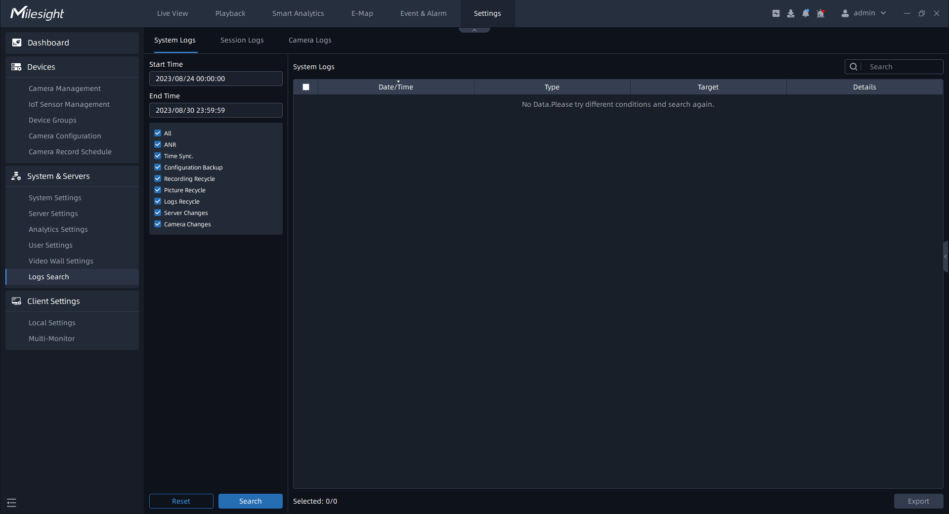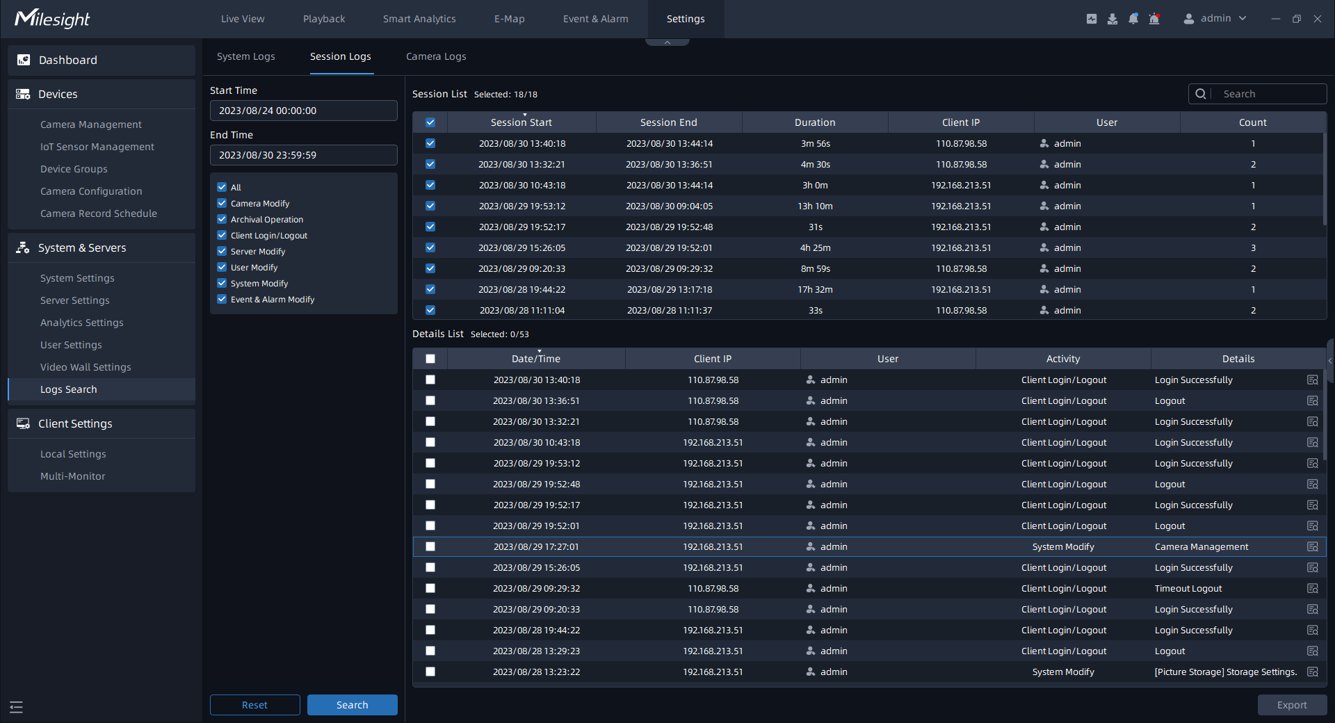 There are three parts in the Logs window, including System Logs, Session Logs and Camera Logs. Here you can check, search and export the interested logs.;