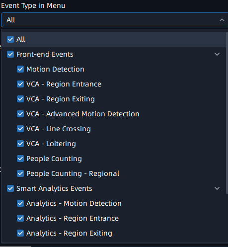 Check the checkbox to display the corresponding event type on Live View interface when right click the menu. The event type includes Front-end Events and Smart Analytics Events, you can also check “Any Event” option to display all event types with one click.