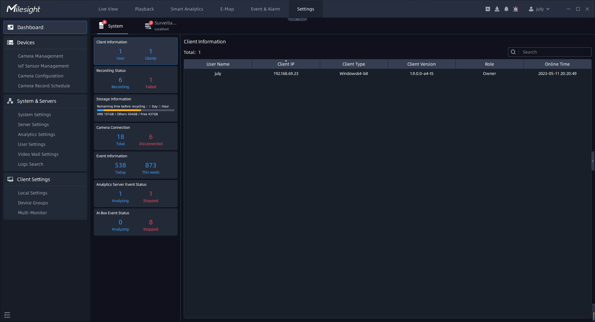 Here you can view the status and resource usage of the system and its servers. When you click “Settings->Dashboard”, the window will show as below.