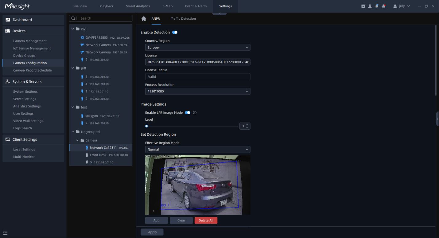 This part is to enable the license plate recognition function and set related detection configuration for Milesight cameras which supports LPR function.