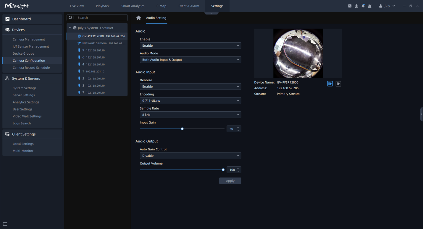 Denoise: Set it as Enable/Disable. When you enable the function, the noise detected can be filtered. Encoding: G.711-ALaw, AAC LC, G.722 and G.726 are available. Sample Rate: 8KHz, 16KHz, 32KHz, 44.1KHz, and 48KHz are available. Audio Bit Rate: The function is available only for AAC LC, and supports up to 256kbps. Input Gain: Input audio gain level, 0-100. |