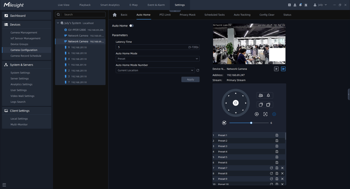 Auto Home allows the PTZ camera to return to a predefined Home Position automatically