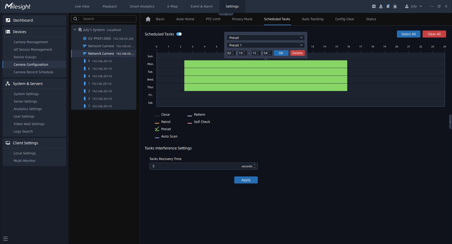 Step3: Set the Task Recovery Time (from 5-720 seconds). You can set the time (a period of inactivity) before the PTZ camera starts the schedule and task details.