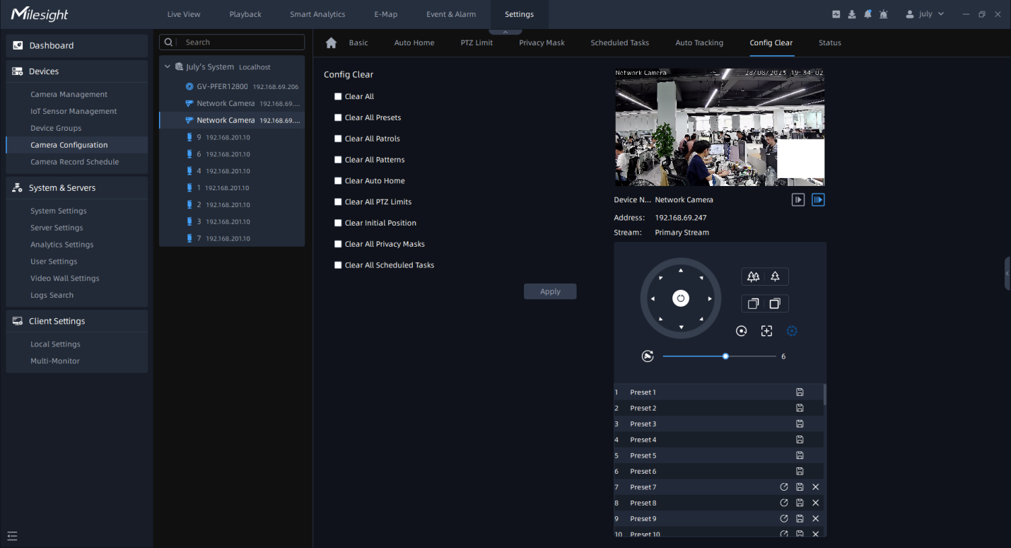 Here you can clear PTZ configurations which you set before, including Clear All, Clear All Presets, Clear All Patrols, Clear All Patterns, Clear Auto Home, Clear All PTZ Limits , Clear All Privacy Masks and Clear All Scheduled Tasks. After checking the configuration clear checkbox, click “Apply” button.