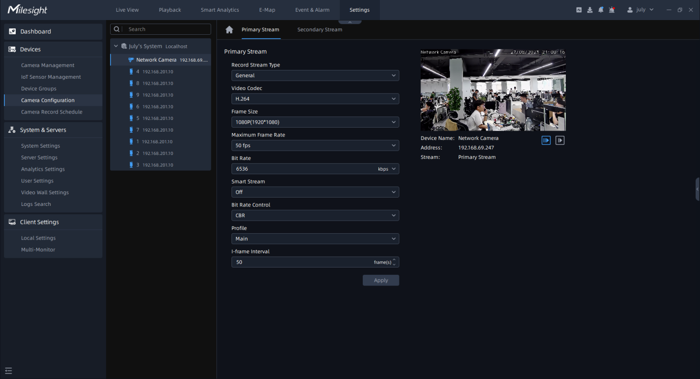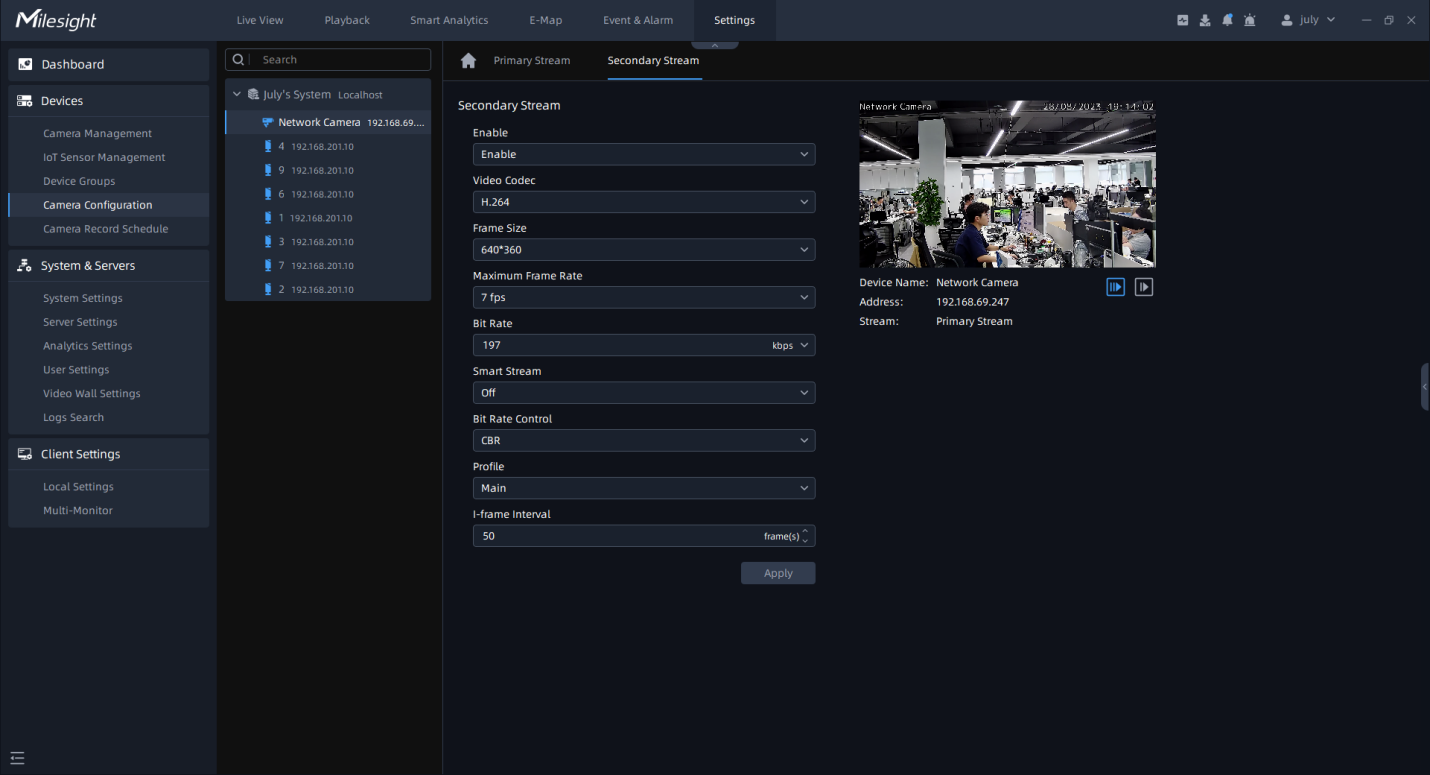 This item is available only if you set set Secondary Stream for the device. |