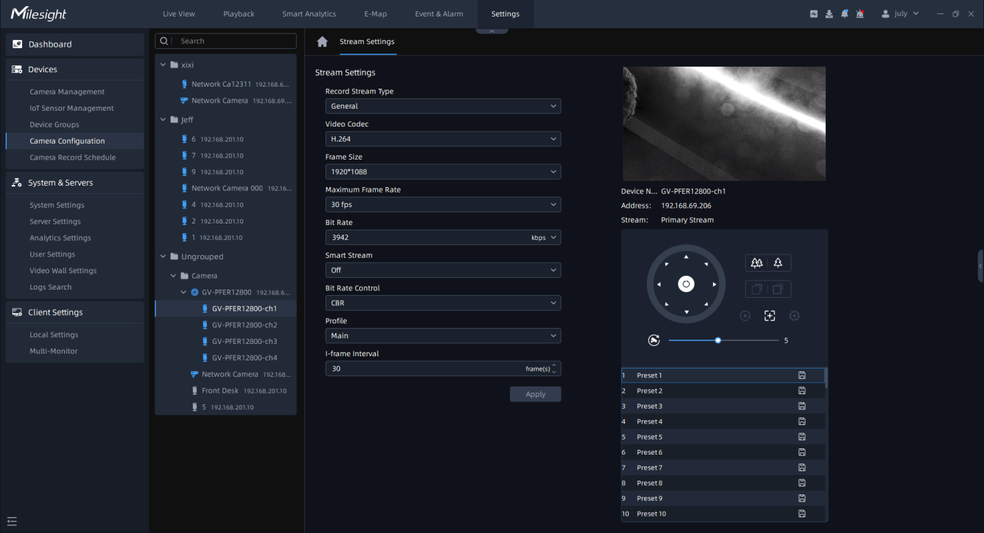 For Primary Stream, it includes 1080P (1920*1080), 1.3M (1280*960), 720P (1280*720), D1 (704*576). For Secondary Stream, it includes D1 (704*576), 640*480, 640*360, 352*288, 320*240, 320*192, 320*180. |