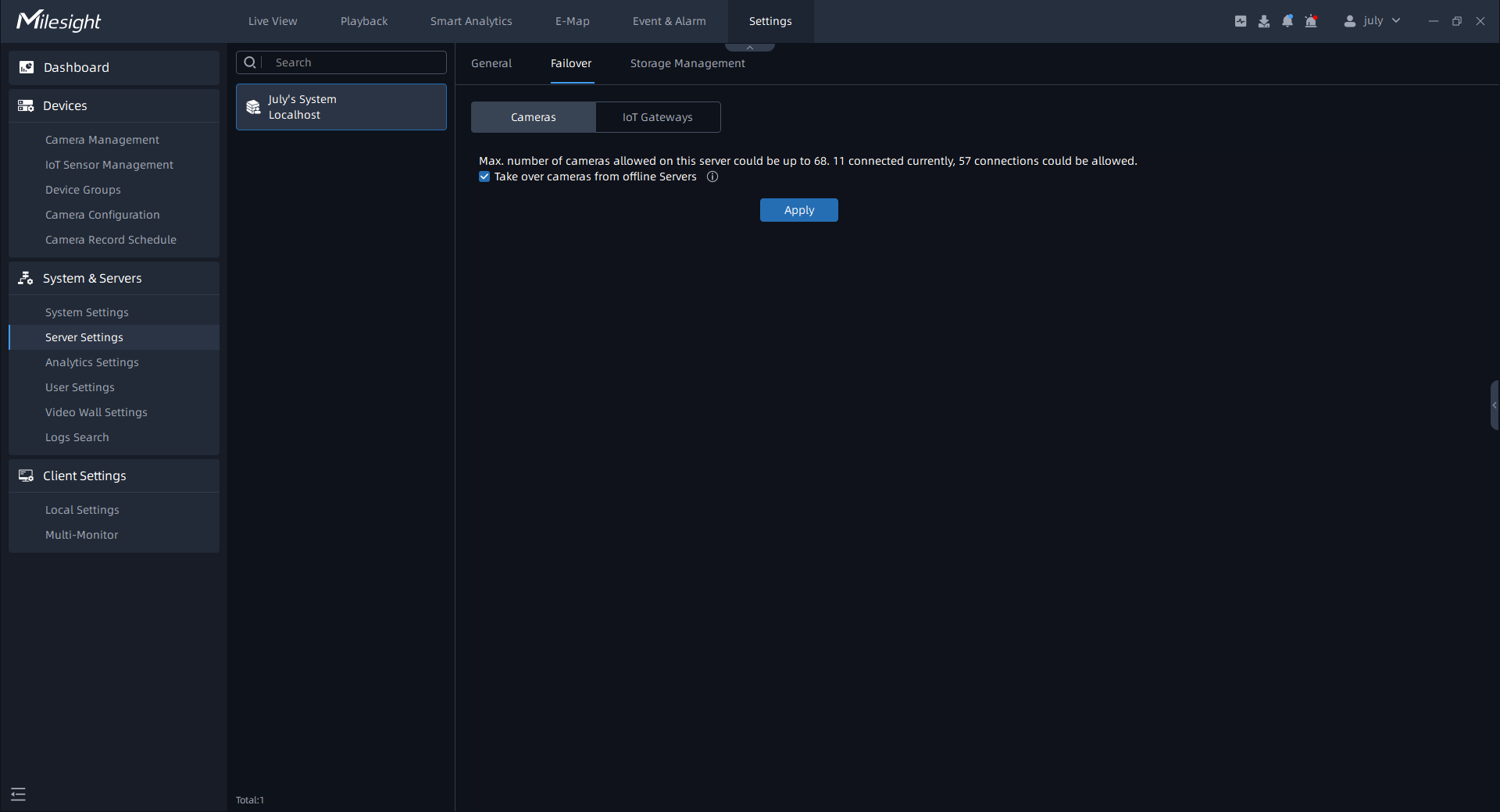 Click “Server Settings->Failover” button, and then you can set the failover function in this interface. This function allows the current server to take over the cameras and IoT gateways from the offline server.