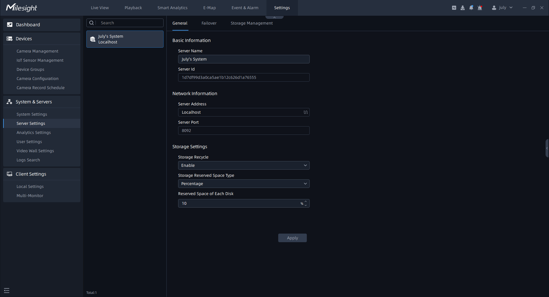 User can check and configure basic server settings. There are several parts, including Basic Information, Network Information, Storage Setting and Detach from system. Click “Server Settings->General” button, the page will show as below: