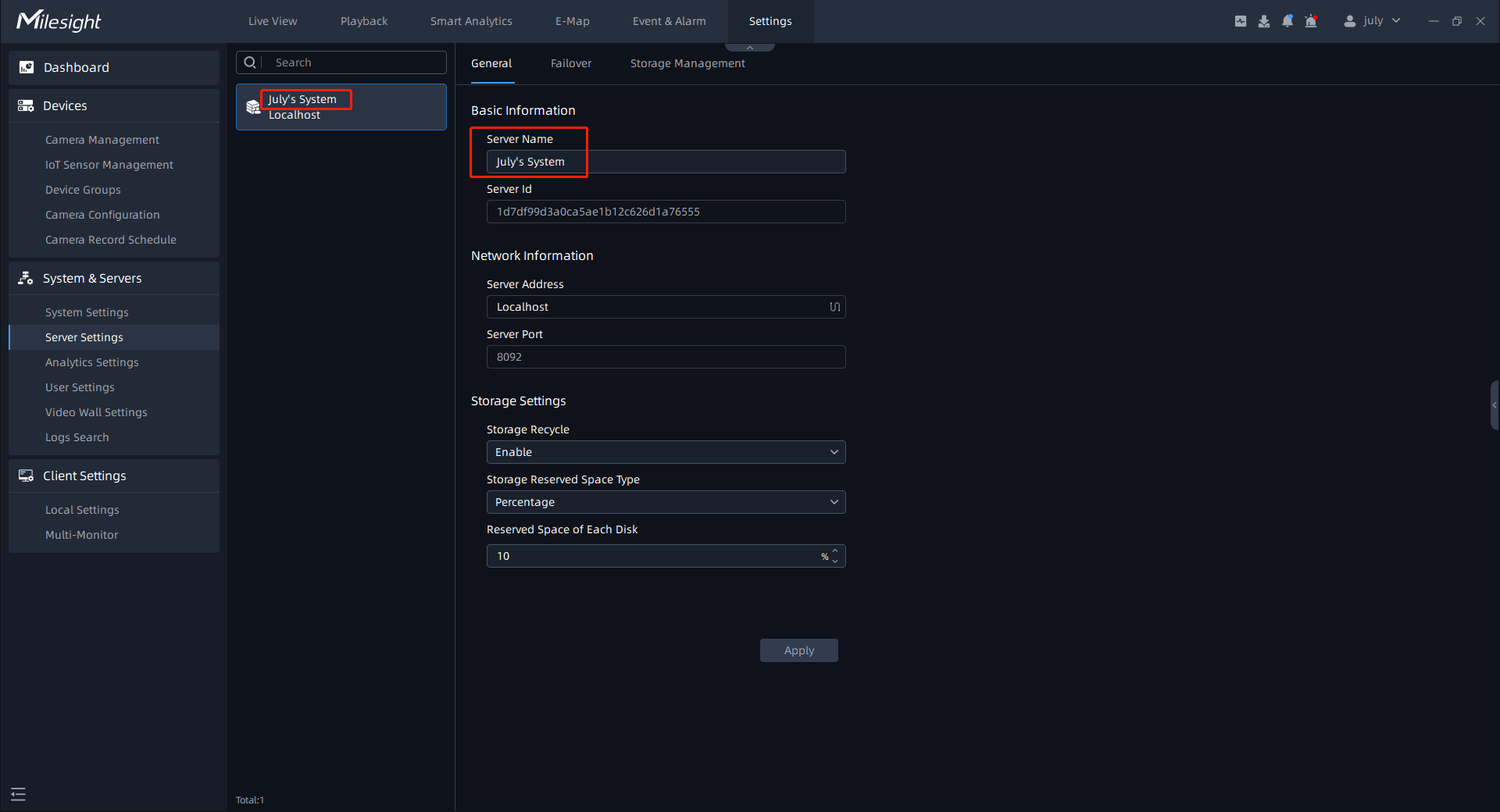 Here you can change name of each server inside VMS system. Select a server and change its