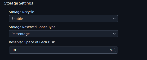 If enable Storage Recycle function, it will delete the previous storage files when the disk space reaches the setting threshold value, ensuring that disk storage can be continued.