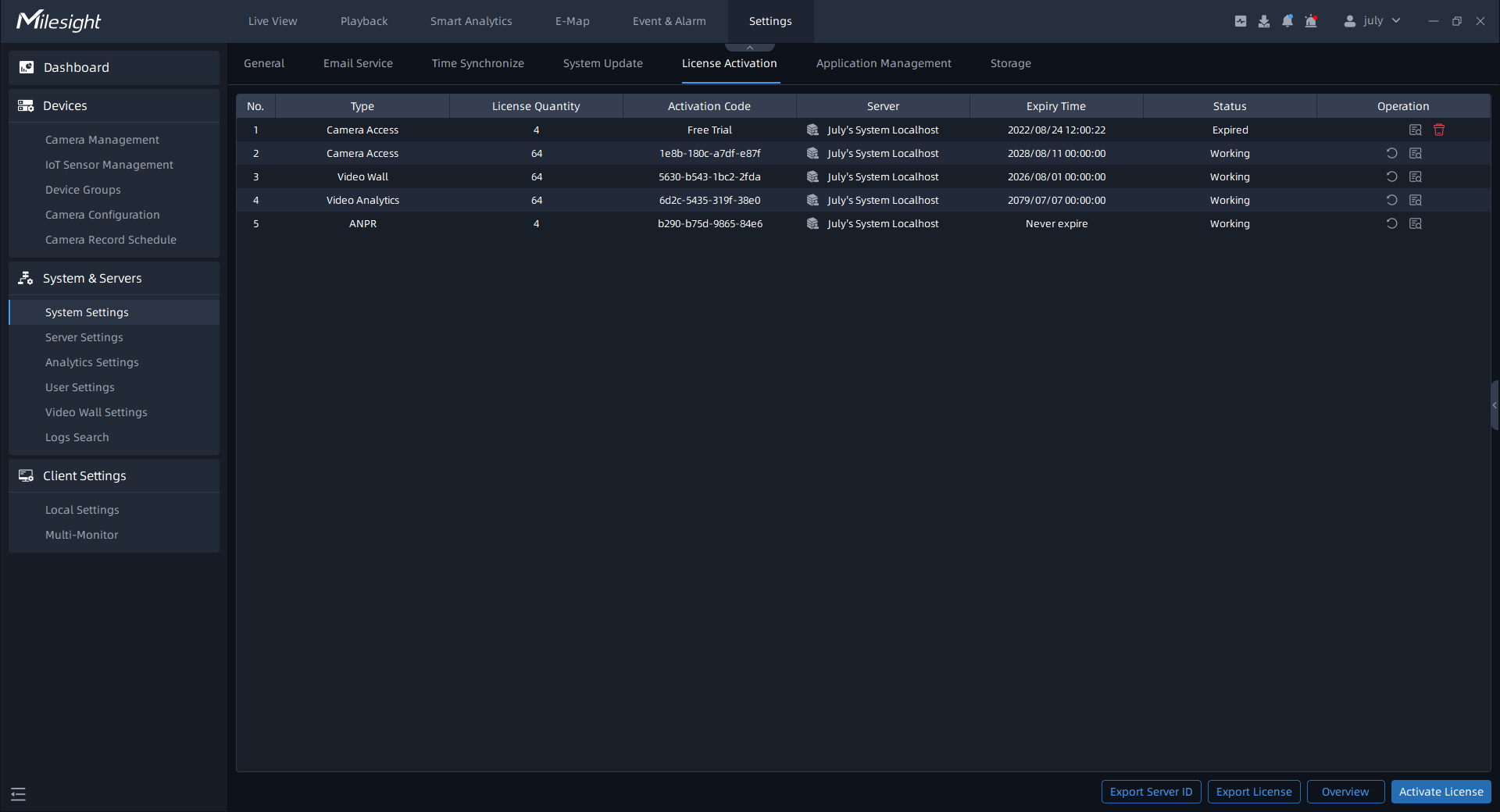 Now our VMS supports Camera Access License, Video Wall License, Video Analytics License and ANPR License.
