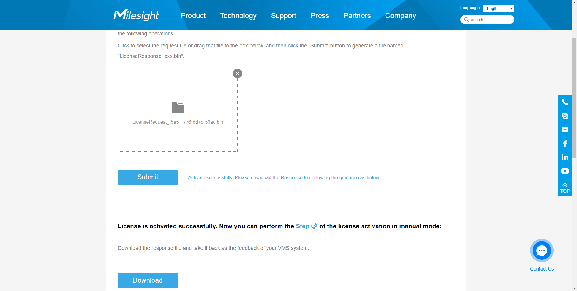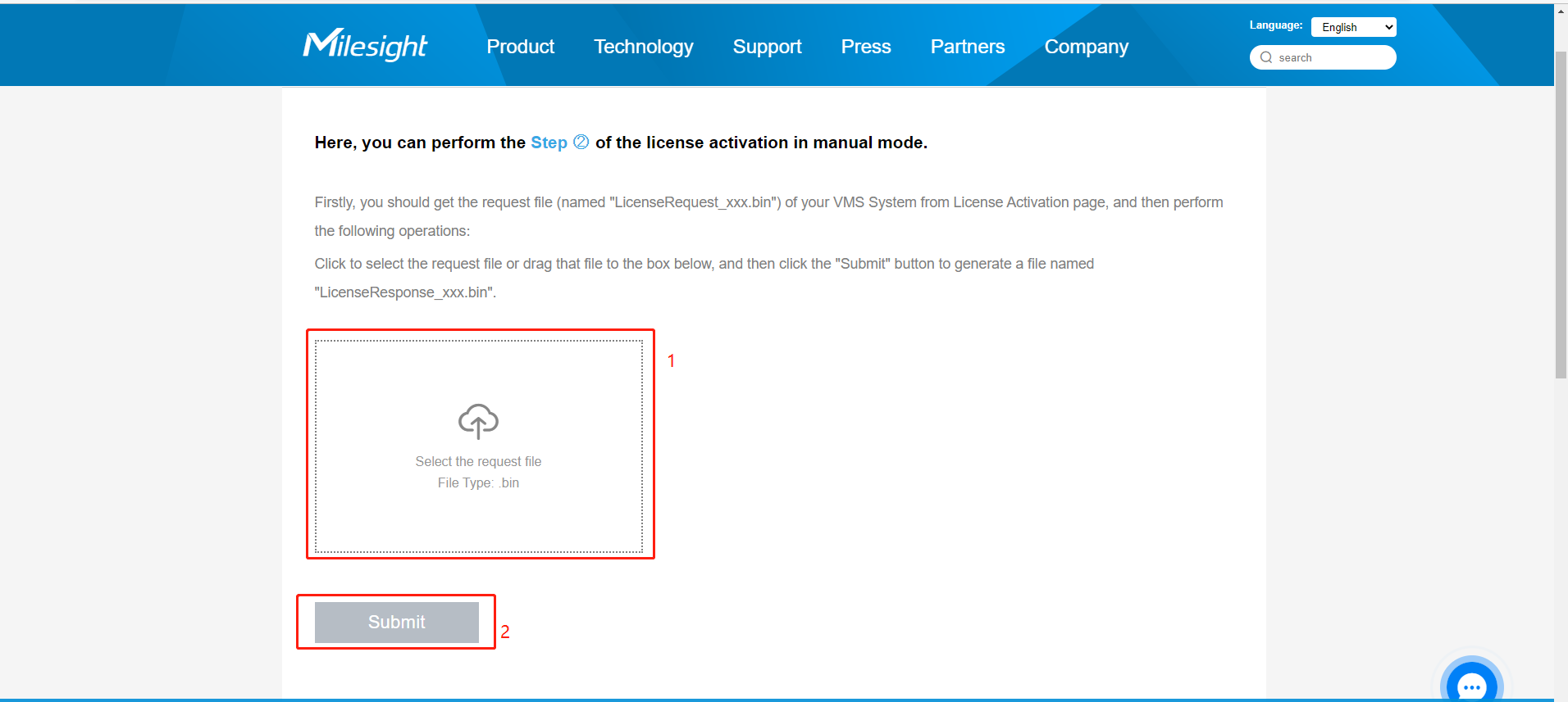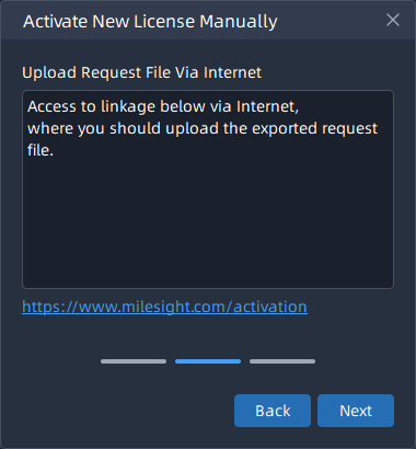 Step4: Copy the address to another online server URL search box and the Milesight License Activation website will show as below. You can upload the previous exported LicenseRequest_xxxx-xxxx-xxxx-xxxx.bin here;