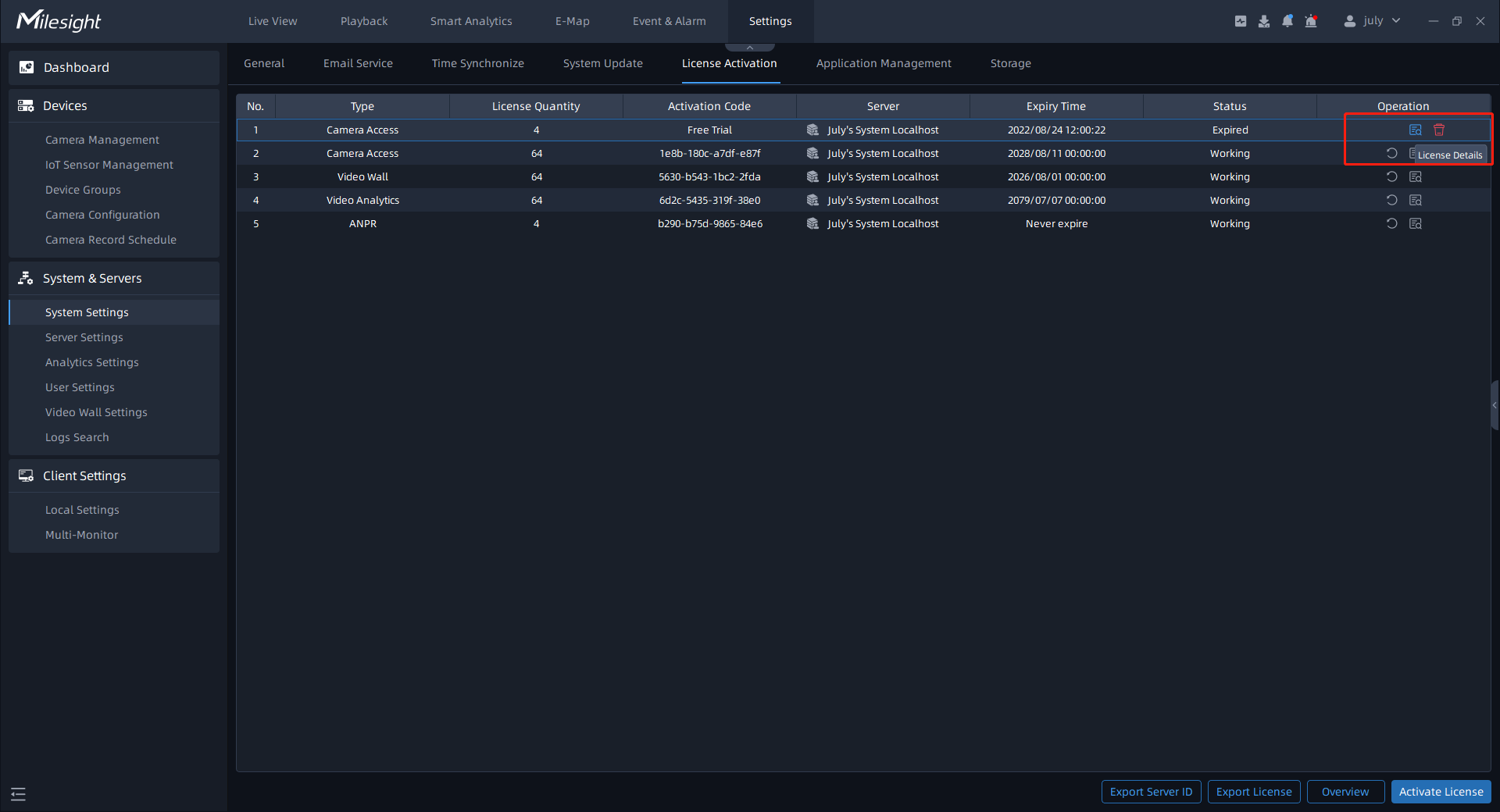 After activating the license successfully, the license will be added to the License Activation list and displayed working status.