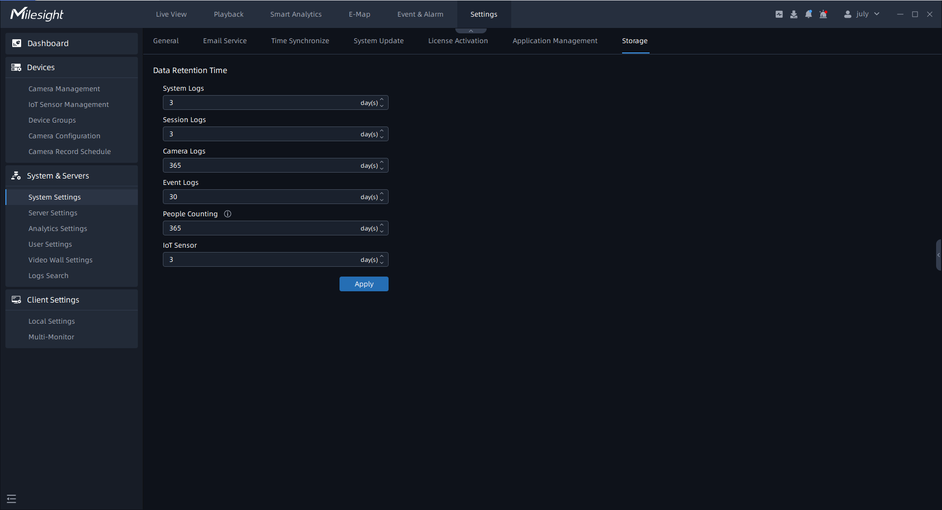 The storage page allows you to manage the data retention time, ranging from 1 to 9999 days, for different components,including System Logs, Session Logs, Camera Logs, Event Logs, People Counting and IoT Sensor. It helps optimize storage usage and ensures that log data is available for a specific period, based on your needs and compliance requirements.